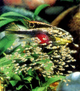 Betina dapat menentukan jantan yang sangat kuat di grupnya dengan langkah mencerahkan warna ungu di perutnya serta menggetarkan badannya didepan si jantan sebagai sinyal siap bereproduksi. telur umumnya ada di permukaan lubang dengan jumlah 50 sampai 300 butir di sarangnya. telur yang berwarna cokelat kemerahan tersebut dapat menetas sesudah 2-3 hari serta ke-2 induknya selalu melindungi anakan ikan tersebut umumnya sampai 28 hari.